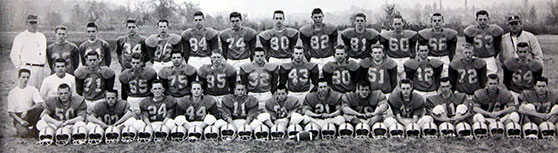The first line-up:... Center - Bill Blake / Guards - Lloyd Roberts & Mike Murcko / Tackles - Bucky Moffett & Ealy / Ends - Ray Eastlick & Dave Hunt / QB - Tom Harpst / HBs - Ralph Boger & Everett Diviere / FB - Ron Hoolver / Split End - Larry Jones.