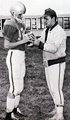 | Besides the team having very limited football experience, most of the players had never saw a football game. When the equipment did arrive on the fourth day of practice many of the players needed help in getting their pads put into their pants correctly and getting their shoulder pads on right. Tom Harpst, the first quarterback was one who had never seen a football game, so Coach Bouch took him to a game on a Saturday night and then on the following Monday Tom started as quarterback in Reynolds’ first football game. |